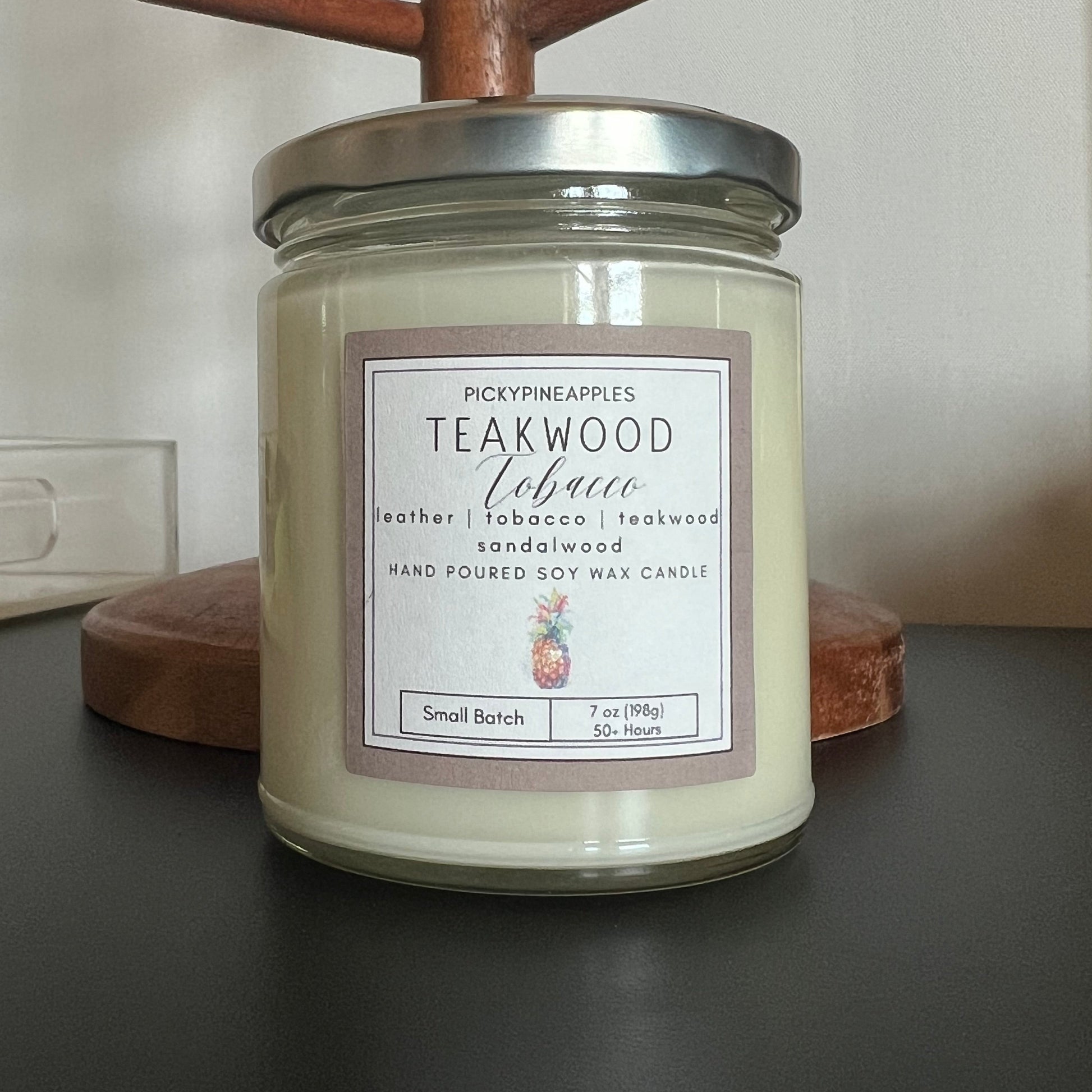 Indulge in the warm and inviting ambiance of our hand poured Teakwood Tobacco Candle. Made with soy wax, this candle offers a clean burn and features a rich combination of leather and tobacco scents. Relax and unwind while enjoying the enticing aroma and rustic charm of this scent.